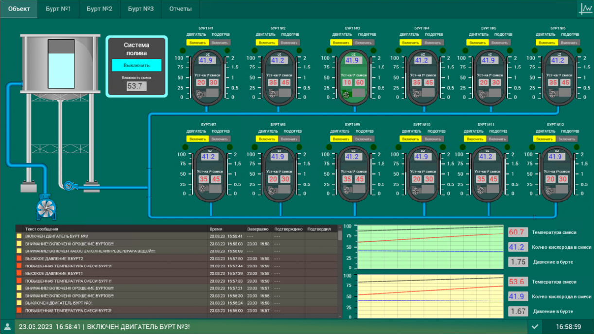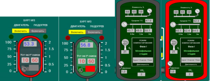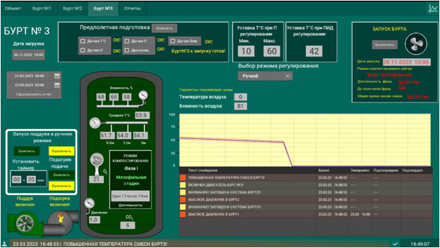 Ведение и визуальное отображение параметров процесса биотермического анаэробного компостирования выводится на монитор персонального компьютера оператора и предназначено для наглядного отображения значений параметров технологического процесса в реальном времени и оперативного управления этими параметрами, через автоматизированную подачу электронных команд на исполнительные элементы Климатической камеры, ведения технологического электронного протокола с созданием архива данных о событиях, мероприятиях, изменениях, командах, их значений и влияний на процесс биотермического аэробного компостирования.